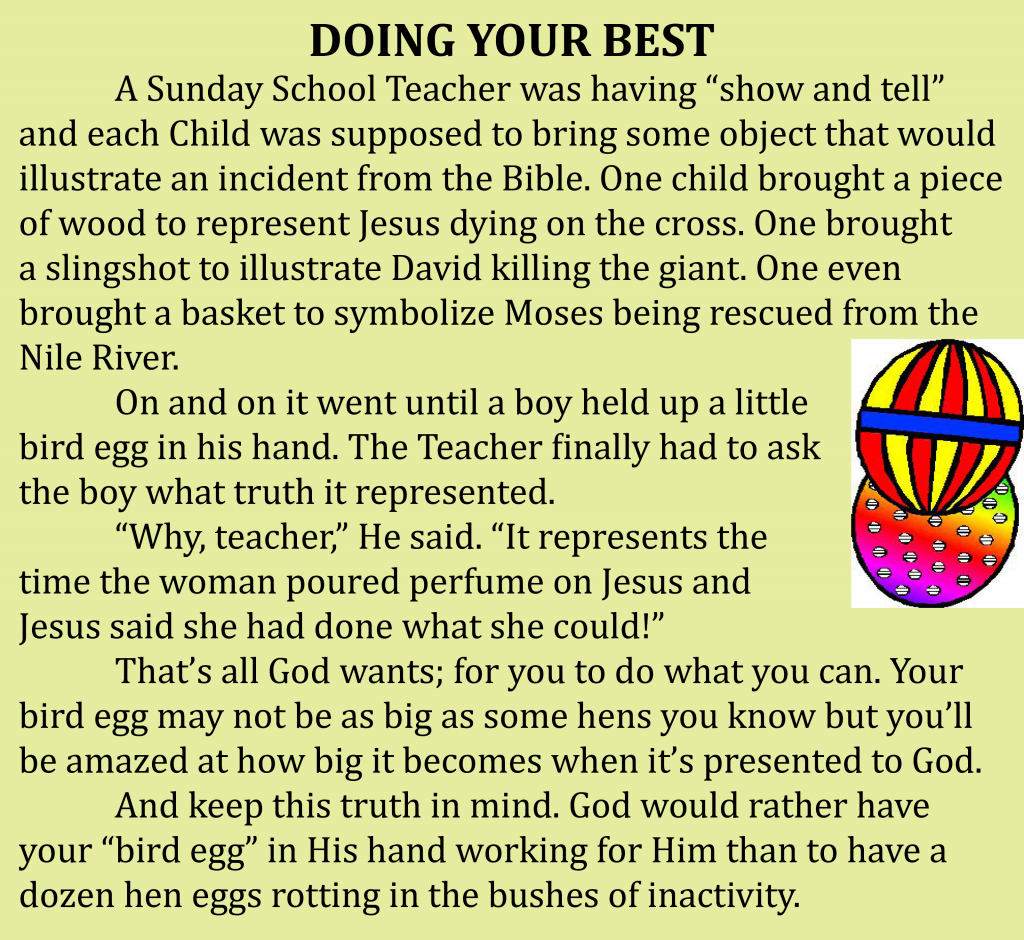 Do What you Can; Where you Are; with What you Have- and be amazed at the Great Things a Great God can Do!